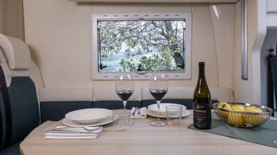 Zwei Wohnbereiche: eine in Fahrtrichtung ausgerichtete Sitzgruppe (Dinette) für vier Personen, die mit den drehbaren Sitzen im Fahrerhaus verbunden ist, und eine geräumige U-Sitzgruppe im Heck, die perfekt ist, um bis zu sechs Freunde unterzubringen. Und darüber? Ein elektrisches Hubbett für traumhafte Entspannung sowie ein elektrisch verstellbarer Tisch, um ein zusätzliches Längs-Doppelbett zu erhalten.