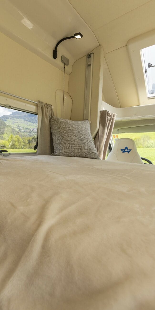 Das elektrische Hubbett, das sich über der Sitzgruppe befindet, lässt sich auf Tischhöhe absenken, sodass man auch ohne Leiter einsteigen kann: eine smarte Lösung zur Platzoptimierung und für maximalen Komfort.