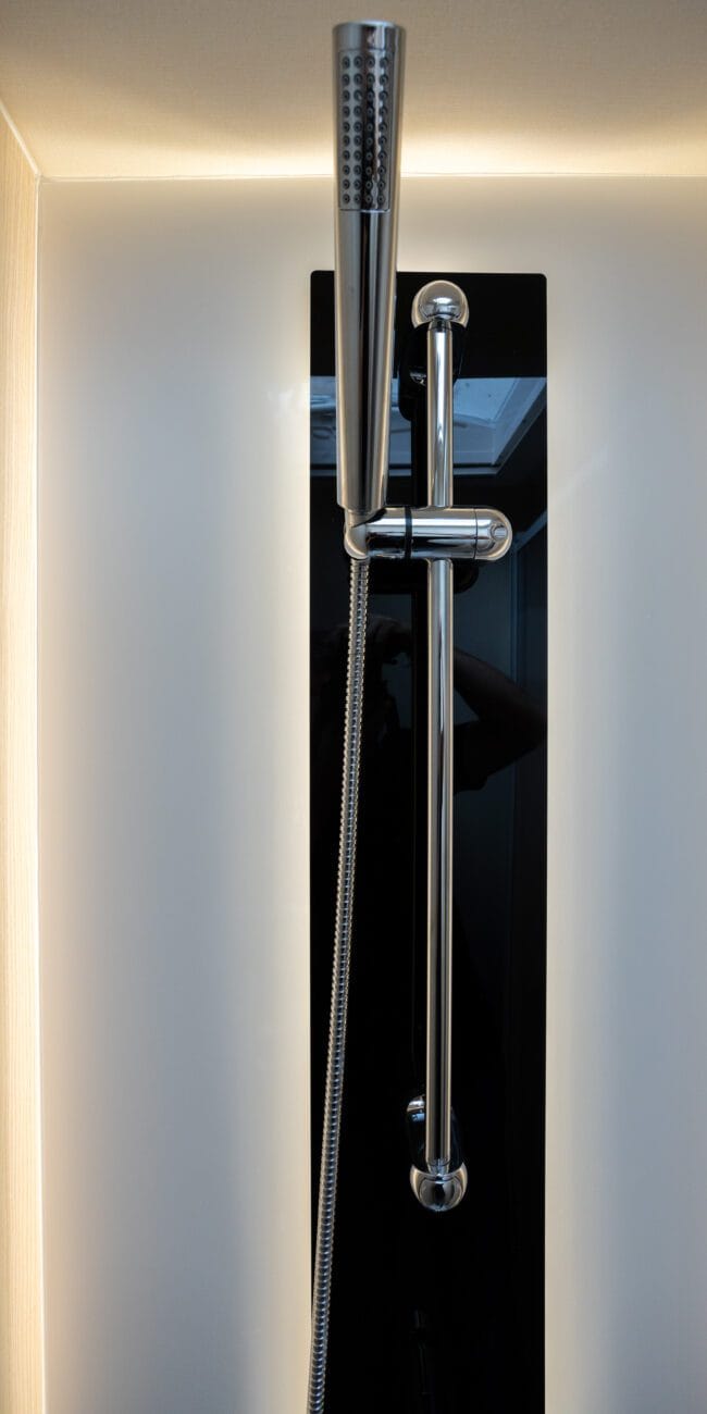 Das Badezimmer des SPECIAL 645 ist das größte der Baureihe, mit WC und Dusche in separaten Räumen, die durch eine Tür verschlossen sind, die sie von der Sitzgruppe trennt und so Komfort und Privatsphäre garantiert.